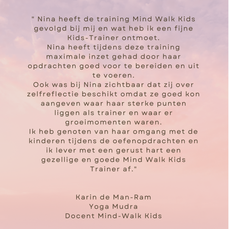 Ik ben gecertificeerd Mind-Walk Trainer ® voor kinderen en geef Mind-Walk® cursussen, workshops voor kinderen op basisscholen, BSO en kinderdagverblijven. Daarnaast organiseer ik leerzame ouder-kind sessies (variërend van 60 minuten tot een dagdeel) in de natuur of in een fijne, geschikte ruimte binnen. Heerlijk (buiten) bewegen in combinatie met meditatie, mindfulness, spelletjes, yoga en natuurbewustwording, geschikt voor kids van 4 tot ca. 12 jaar.